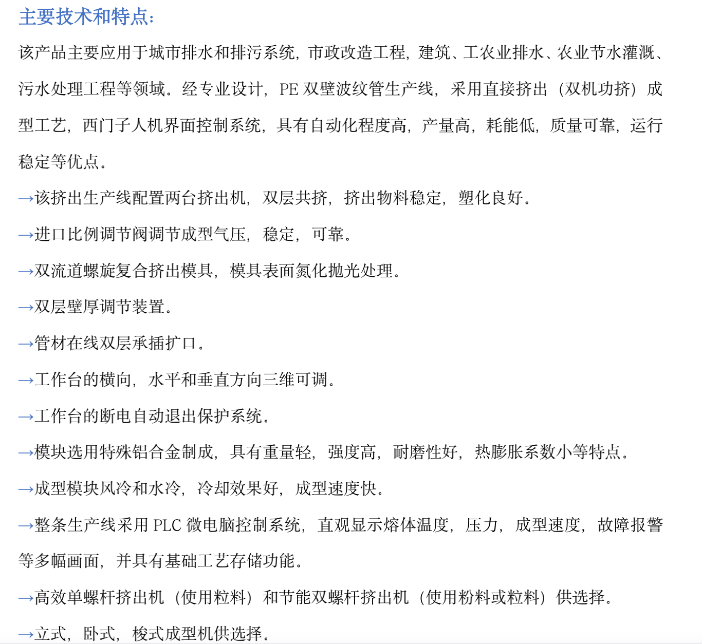 該產(chǎn)品主要應(yīng)用于城市排水和排污系統(tǒng),市政改造工程,建筑、工農(nóng)業(yè)排水、農(nóng)業(yè)節(jié)水灌溉、污水處理工程等領(lǐng)域。經(jīng)專(zhuān)業(yè)設(shè)計(jì),PE雙壁波紋管生產(chǎn)線(xiàn),采用直接擠出(雙機(jī)功擠)成型工藝,西門(mén)子人機(jī)界面控制系統(tǒng),具有自動(dòng)化程度高,產(chǎn)量高,耗能低,質(zhì)量可靠,運(yùn)行穩(wěn)定等優(yōu)點(diǎn)。 →該擠出生產(chǎn)線(xiàn)配置兩臺(tái)擠出機(jī),雙層共擠,擠出物料穩(wěn)定,塑化良好。 →進(jìn)口比例調(diào)節(jié)閥調(diào)節(jié)成型氣壓,穩(wěn)定,可靠。 →雙流道螺旋復(fù)合擠出模具,模具表面氮化拋光處理。 →雙層壁厚調(diào)節(jié)裝置。 →管材在線(xiàn)雙層承插擴(kuò)口。 →工作臺(tái)的橫向,水平和垂直方向三維可調(diào)。 →工作臺(tái)的斷電自動(dòng)退出保護(hù)系統(tǒng)。 →模塊選用特殊鋁合金制成,具有重量輕,強(qiáng)度高,耐磨性好,熱膨脹系數(shù)小等特點(diǎn)。 →成型模塊風(fēng)冷和水冷,冷卻效果好,成型速度快。 →整條生產(chǎn)線(xiàn)采用PLC微電腦控制系統(tǒng),直觀顯示熔體溫度,壓力,成型速度,故障報(bào)警等多幅畫(huà)面,并具有基礎(chǔ)工藝存儲(chǔ)功能。 →高效單螺桿擠出機(jī)(使用粒料)和節(jié)能雙螺桿擠出機(jī)(使用粉料或粒料)供選擇。 →立式,臥式,梭式成型機(jī)供選擇。