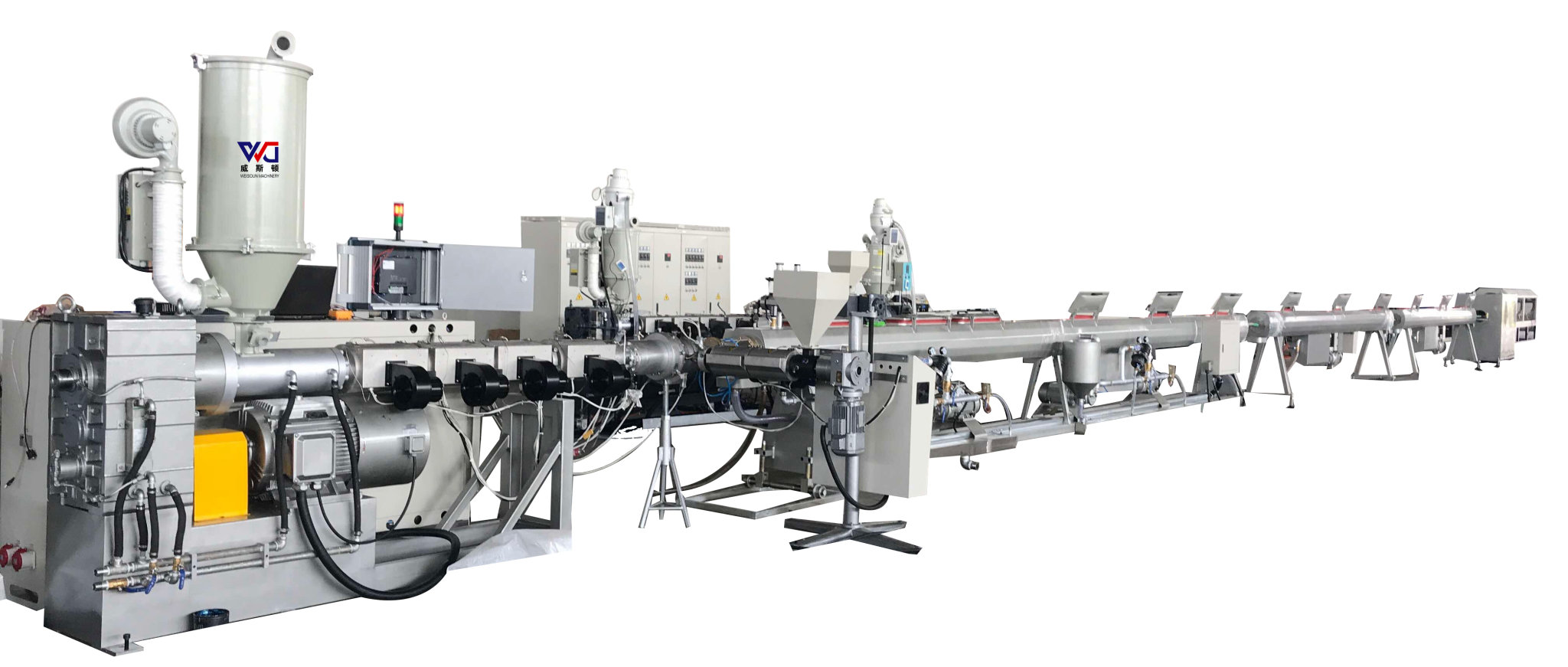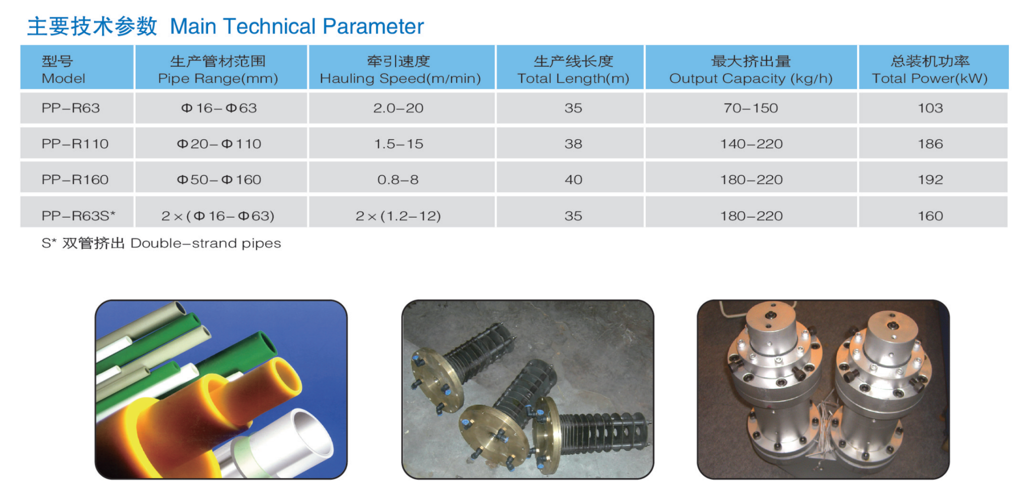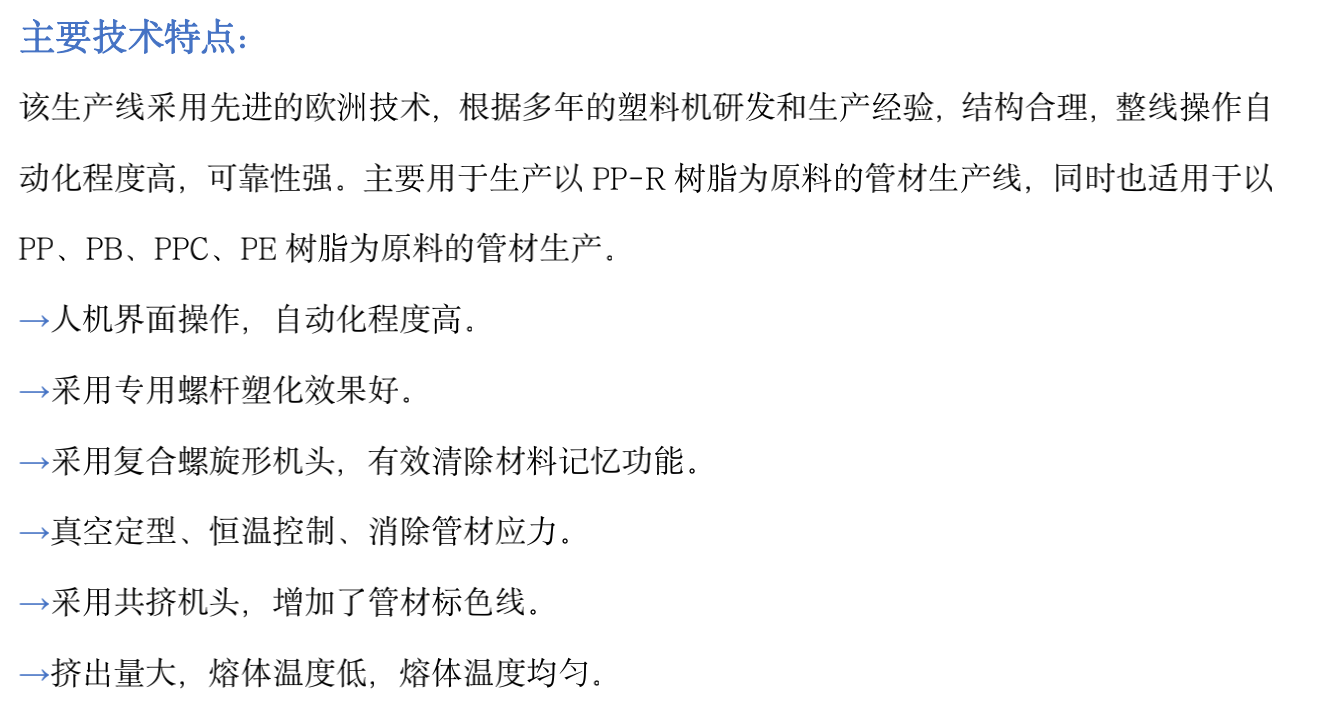 該生產(chǎn)線采用先進(jìn)的歐洲技術(shù),根據(jù)多年的塑料機(jī)研發(fā)和生產(chǎn)經(jīng)驗(yàn),結(jié)構(gòu)合理,整線操作自動(dòng)化程度高,可靠性強(qiáng)。主要用于生產(chǎn)以PP-R樹脂為原料的管材生產(chǎn)線,同時(shí)也適用于以PP、PB、PPC、PE樹脂為原料的管材生產(chǎn)。 →人機(jī)界面操作,自動(dòng)化程度高。 →采用專用螺桿塑化效果好。 →采用復(fù)合螺旋形機(jī)頭,有效清除材料記憶功能。 →真空定型、恒溫控制、消除管材應(yīng)力。 →采用共擠機(jī)頭,增加了管材標(biāo)色線。 →擠出量大,熔體溫度低,熔體溫度均勻。