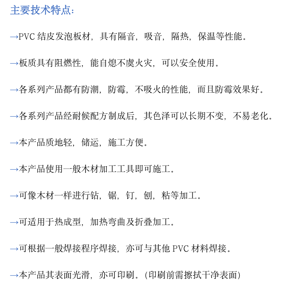 →PVC結(jié)皮發(fā)泡板材,具有隔音,吸音,隔熱,保溫等性能。 →板質(zhì)具有阻燃性,能自熄不虞火災(zāi),可以安全使用。 →各系列產(chǎn)品都有防潮,防霉,不吸火的性能,而且防霉效果好。 →各系列產(chǎn)品經(jīng)耐候配方制成后,其色澤可以長(zhǎng)期不變,不易老化。 →本產(chǎn)品質(zhì)地輕,儲(chǔ)運(yùn),施工方便。 →本產(chǎn)品使用一般木材加工工具即可施工。 →可像木材一樣進(jìn)行鉆,鋸,釘,刨,粘等加工。 →可適用于熱成型,加熱彎曲及折疊加工。 →可根據(jù)一般焊接程序焊接,亦可與其他PVC材料焊接。 →本產(chǎn)品其表面光滑,亦可印刷。(印刷前需擦拭干凈表面)