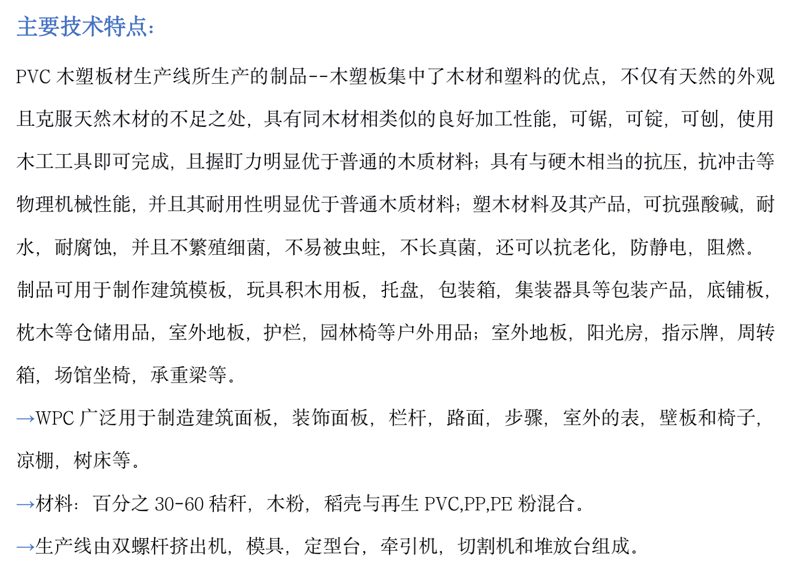PVC木塑板材生產(chǎn)線所生產(chǎn)的制品--木塑板集中了木材和塑料的優(yōu)點(diǎn),不僅有天然的外觀且克服天然木材的不足之處,具有同木材相類似的良好加工性能,可鋸,可錠,可刨,使用木工工具即可完成,且握盯力明顯優(yōu)于普通的木質(zhì)材料;具有與硬木相當(dāng)?shù)目箟?,抗沖擊等物理機(jī)械性能,并且其耐用性明顯優(yōu)于普通木質(zhì)材料;塑木材料及其產(chǎn)品,可抗強(qiáng)酸堿,耐水,耐腐蝕,并且不繁殖細(xì)菌,不易被蟲蛀,不長真菌,還可以抗老化,防靜電,阻燃。 制品可用于制作建筑模板,玩具積木用板,托盤,包裝箱,集裝器具等包裝產(chǎn)品,底鋪板,枕木等倉儲用品,室外地板,護(hù)欄,園林椅等戶外用品;室外地板,陽光房,指示牌,周轉(zhuǎn)箱,場館坐椅,承重梁等。 →WPC廣泛用于制造建筑面板,裝飾面板,欄桿,路面,步驟,室外的表,壁板和椅子,涼棚,樹床等。 →材料:百分之30-60秸稈,木粉,稻殼與再生PVC,PP,PE粉混合。 →生產(chǎn)線由雙螺桿擠出機(jī),模具,定型臺,牽引機(jī),切割機(jī)和堆放臺組成。