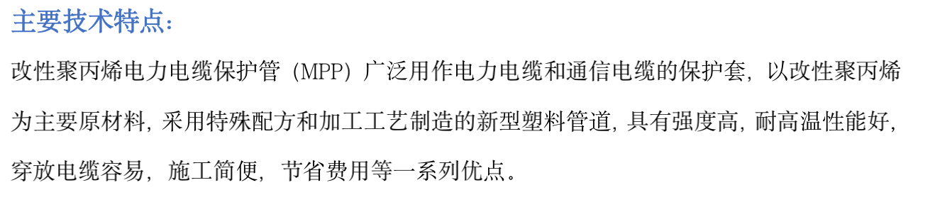 改性聚丙烯電力電纜保護管(MPP)廣泛用作電力電纜和通信電纜的保護套,以改性聚丙烯為主要原材料,采用特殊配方和加工工藝制造的新型塑料管道,具有強度高,耐高溫性能好,穿放電纜容易,施工簡便,節(jié)省費用等一系列優(yōu)點。