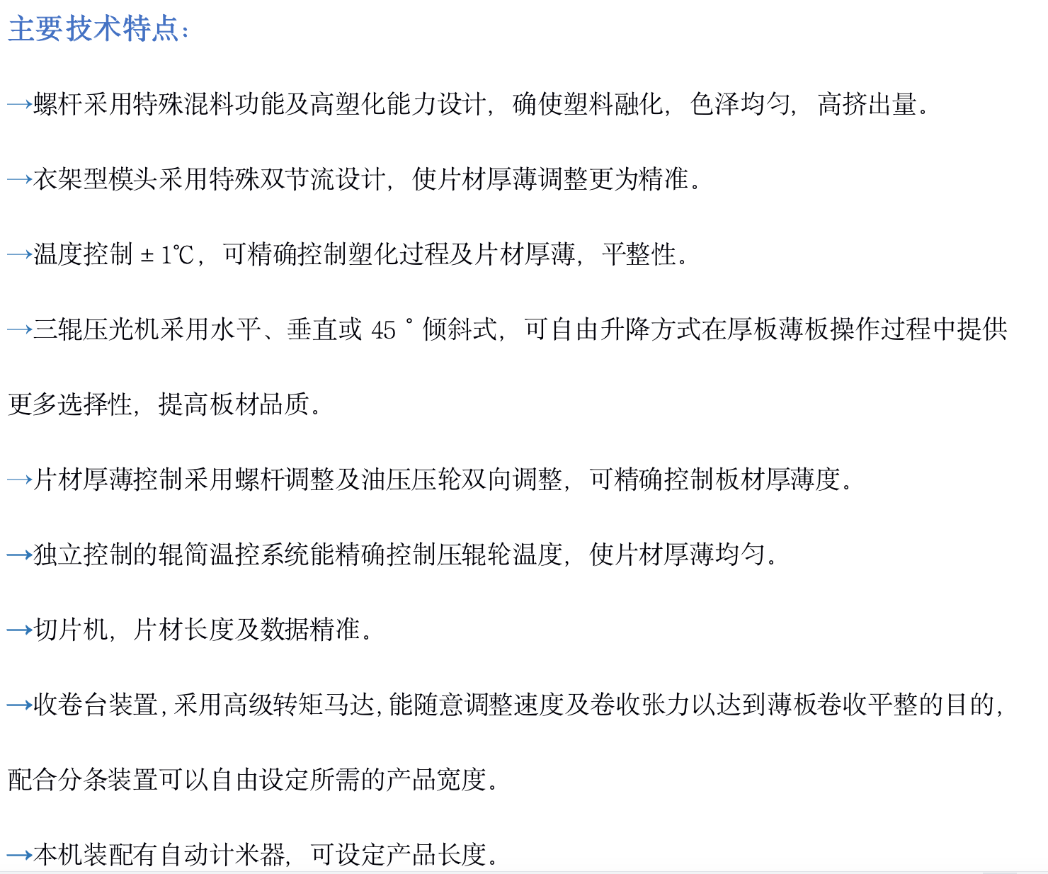 →螺桿采用特殊混料功能及高塑化能力設(shè)計,確使塑料融化,色澤均勻,高擠出量。 →衣架型模頭采用特殊雙節(jié)流設(shè)計,使片材厚薄調(diào)整更為精準。 →溫度控制±1℃,可精確控制塑化過程及片材厚薄,平整性。 →三輥壓光機采用水平、垂直或45°傾斜式,可自由升降方式在厚板薄板操作過程中提供更多選擇性,提高板材品質(zhì)。 →片材厚薄控制采用螺桿調(diào)整及油壓壓輪雙向調(diào)整,可精確控制板材厚薄度。 →獨立控制的輥簡溫控系統(tǒng)能精確控制壓輥輪溫度,使片材厚薄均勻。 →切片機,片材長度及數(shù)據(jù)精準。 →收卷臺裝置,采用高級轉(zhuǎn)矩馬達,能隨意調(diào)整速度及卷收張力以達到薄板卷收平整的目的,配合分條裝置可以自由設(shè)定所需的產(chǎn)品寬度。 →本機裝配有自動計米器,可設(shè)定產(chǎn)品長度。